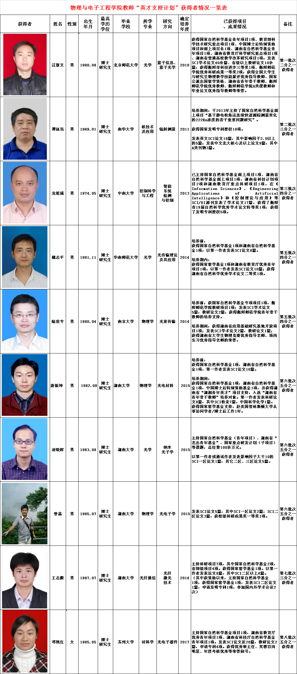 物理与电子工程学院教师“英才支持计划”获得者情况一览表