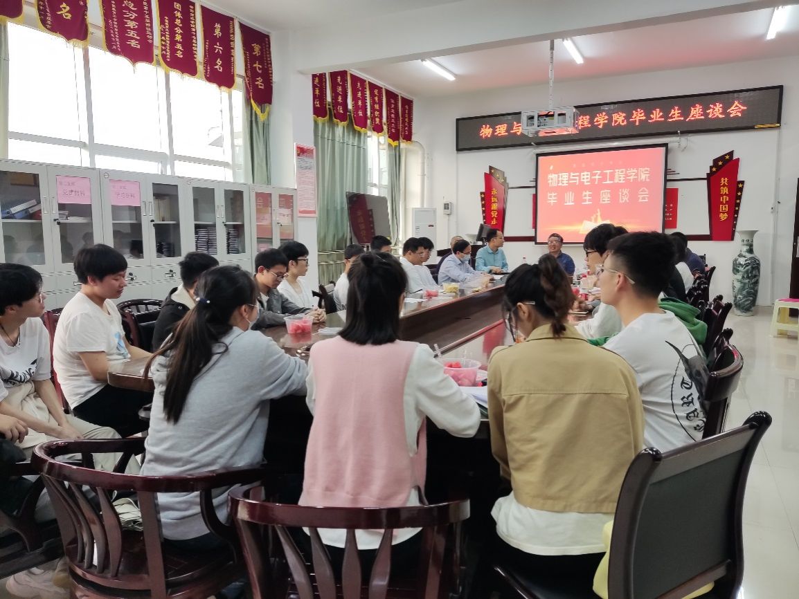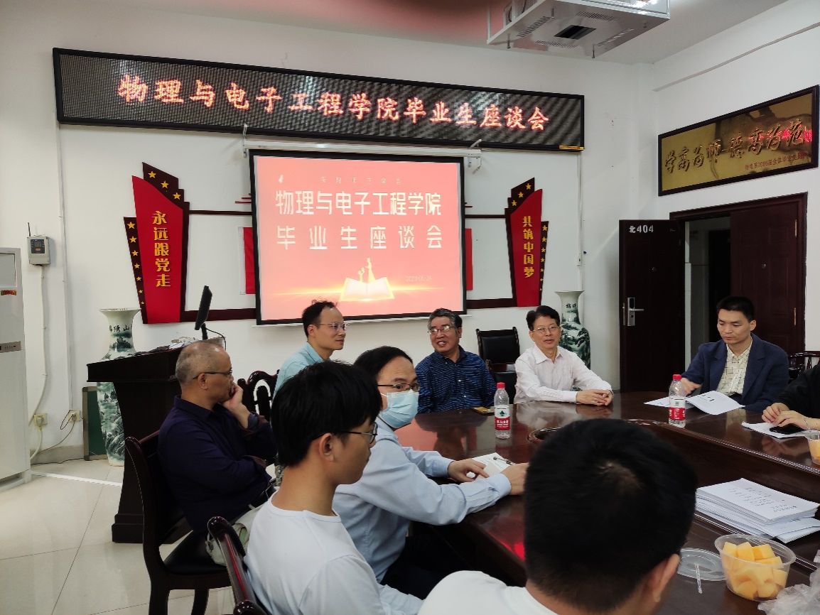 524号下午,物理与电子工程学院在理科楼北404召开2023届本科毕业生座谈会。PA集团官网原副校长张登玉教授、物电学院院长谭延亮教授、物电学院教学工作临时负责人凌晓辉教授、电子工程系主任唐建锋副教授、物理系主任唐世清教授、公共物理系主任赵宜鹏博士、教师代表张军民副教授、辅导员陈功和二十余名毕业生代表参加了此次会议。本次会议由凌晓辉教授主持。