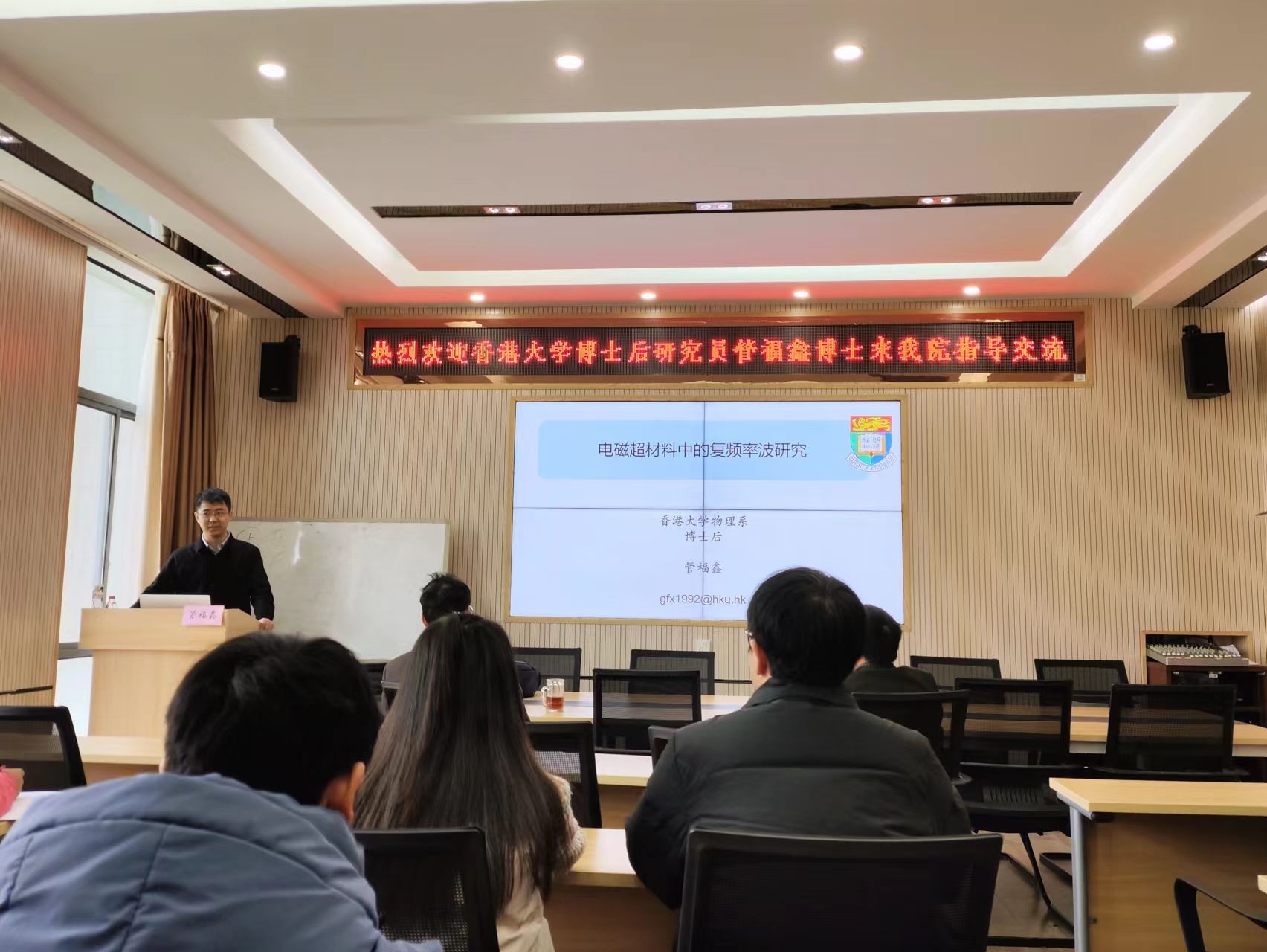 12月28日上午,香港大学博士后研究员管福鑫博士应邀为PA集团官网电子信息硕士研究生作了题为《电磁超材料中的复频率研究》的学术报告。报告会由PA集团官网凌晓辉教授主持。物理与电子工程学院院长谭延亮教授和部分硕士生导师出席了报告会。