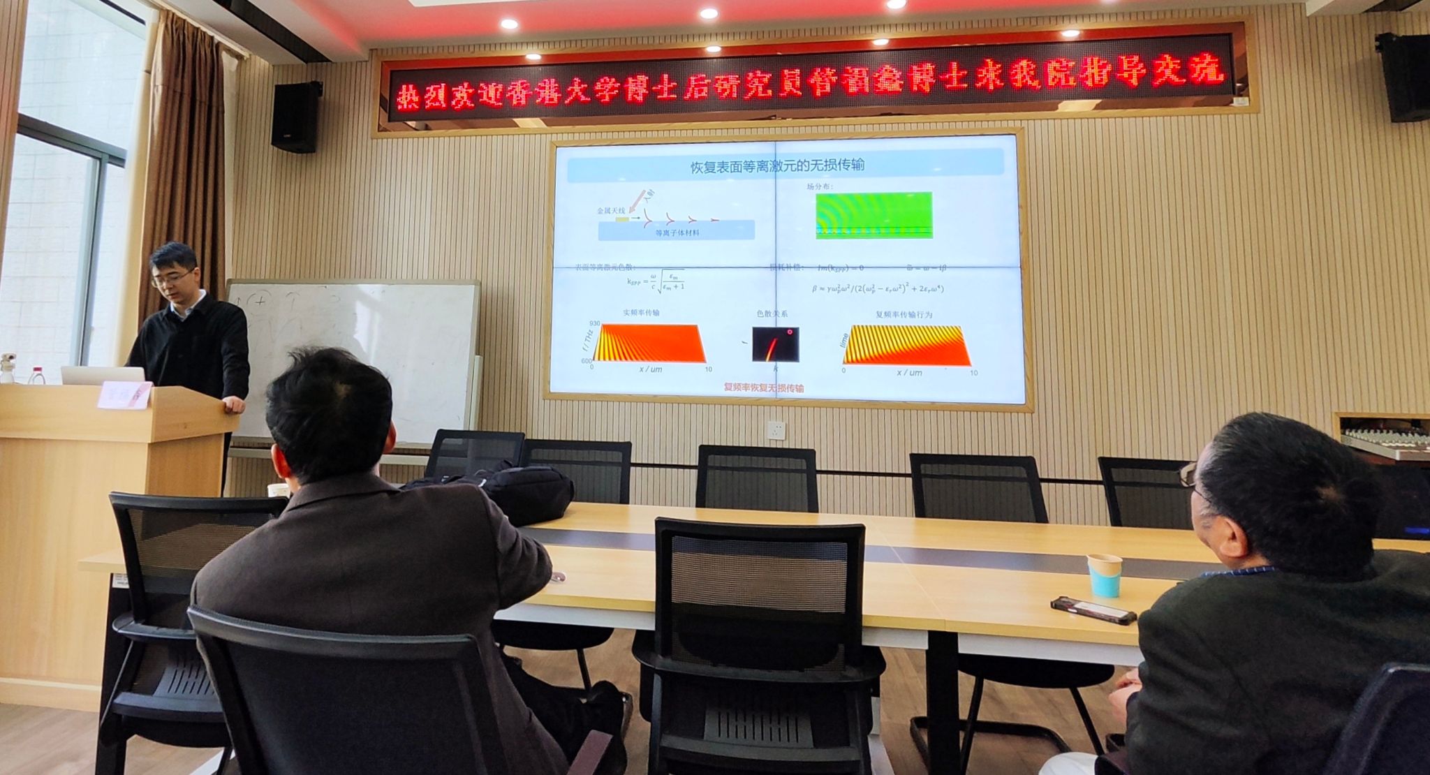 管福鑫博士首先对超构材料和超透镜做了简要介绍,并讲解了超材料中负折射现象、超分辨成像、隐身斗篷和Spoof表面等离激元四种奇特效应。其次,针对传统显微镜成像受制于衍射极限的问题,提出复频率补偿Drude模型,利用该模型合成截断的复频率波,有效解决了实频率波在远距离传输补偿效果不佳的问题。而后,管福鑫博士深入浅出地讲解了利用复频率合成波补偿声子极化激元的传输损耗的原理及仿真和实验结果。最后,管福鑫博士认为以上研究可以扩展到损耗是限制因素的其他应用中,如等离子体传感、非厄米物理等,具有广泛的应用前景。