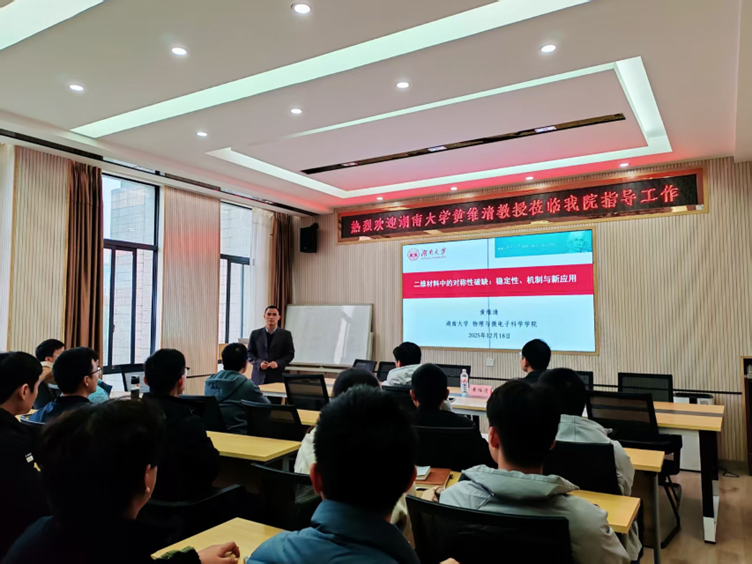 12月18日下午,湖南大学博士生导师黄维清教授应邀来我校进行学术交流,并作了题为《二维材料中的对称性破缺:稳定性、机制与新应用》的专题报告。本次报告由院长谭延亮教授主持,学院教师和学生代表40余人聆听了此次报告。