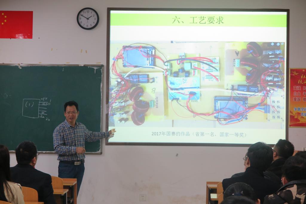 陈文光教授首先简单介绍了新时代下“新工科” 教育的特点、基本条件和电子信息工程专业计划课程体系。然后,以全国大学生电子设计竞赛培训为例,通过电子设计竞赛当中具体的电源设计实例来讲解“新工科”背景下,大学工科专业教育如何提高学生的实践动手和培养学生的工程创新能力,满足新形势下工业化、信息化飞速发展的需要。报告引人入胜,学生听得津津有味,教室内掌声阵阵。