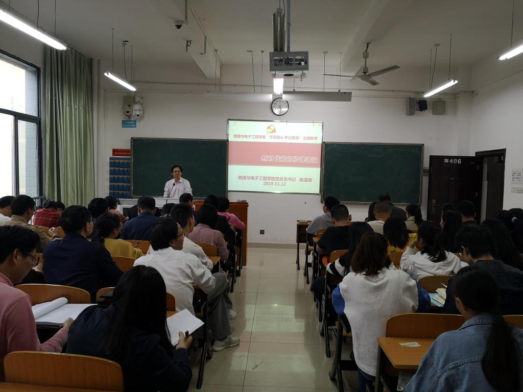 11月12日下午,物理与电子工程学院党总支书记陈溪辉在理科楼南406为学院全体师生党员上党课,主题为:新时代党的纪律建设。