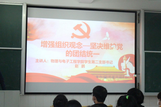 为进一步提高入党积极分子的政治素质,增强对党的政治认同感,10月30日上午,物理与电子工程学院学生第二党支部书记赵鹏老师于文科楼A208教室为第66期入党积极分子开展了主题为“增强组织观念,坚决维护党的团结统一”的党课。物理与电子工程学院、数学与统计学院、马克思主义学院各入党积极分子到场学习。