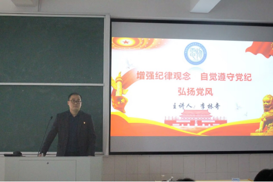 会议伊始,李林奇老师从“把纪律建立在更加突出的位置”、“党的纪律的主要类型”、“新时代如何加强纪律建设”三大方面出发,向同学们讲述了党纪党风的重要意义,接着,李林奇老师通过举毛泽东主席等伟人的事例,让大家了解党的纪律深扎在每一位党员的心中,同时,他通过讲述秦光荣贪污腐败的事例,让各位入党积极分子们深刻领悟到遵守党的纪律的重要性。