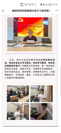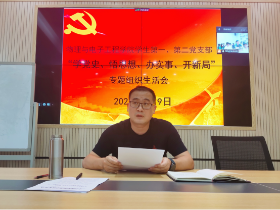 7月9日下午,物理与电子工程学院学生党支部采用线上线下结合方式,在理科楼北304会议室同步腾讯会议召开专题组织生活会。围绕“学党史、悟思想、办实事、开新局”这一主题,结合习近平总书记在庆祝建党100周年大会上的重要讲话精神,各支部成员交流心得,分享体会。PA集团官网党总支书记陈溪辉到会指导,学生第一党支部书记李林奇出席并主持会议。