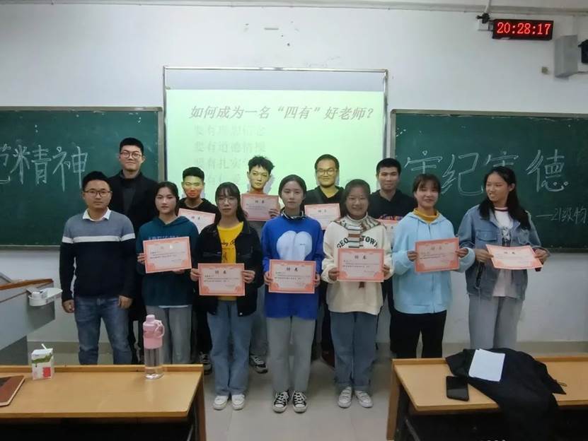 期间在谈及如何成为一名优秀的人民教师时,各班班主任提到了以下“四有”:一、要有理想信念;二、要有道德情操;三、要有扎实学识;四、要有仁爱之心。