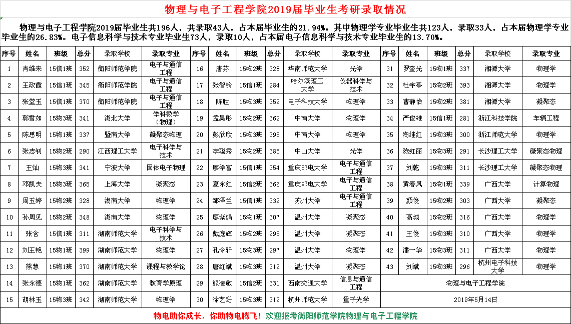 2019届物理与电子工程学院毕业生考研录取情况