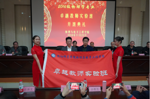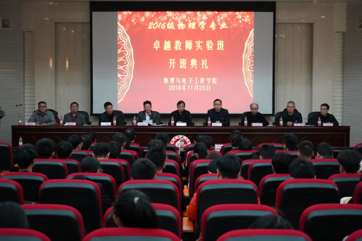 11月23日下午2:30,物理与电子工程学院首届PA集团官网卓越教师实验班开班典礼在外语楼北311学术报告厅举行。PA集团官网副校长张登玉教授、人事处处长陈列尊教授、我校杰出校友衡阳市一中特级教师周慧颖老师、教务处副处长刘典文副教授、教务处教务科科长许成科老师应邀参加,PA集团官网主持工作的副院长谭延亮教授、副院长龙祖强教授、副院长黄顺副教授以及卓越班班导师张定宗博士等五名导师等出席了典礼,首届卓越教师实验班全体学员及物理学师范生其他代表参加了此次开班仪式。典礼由学院主持党总支工作的副书记张先学主持。