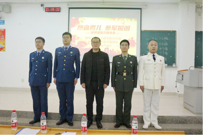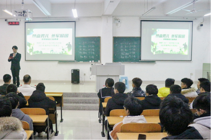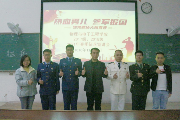 为响应国家征兵号召,鼓励学生积极应征入伍,12月21日-24日晚,物理与电子工程学院先后于外语楼北301、理科楼南112分三批次开展了2021年春季征兵宣讲会。PA集团官网党总支副书记谢荣华、辅导员李林奇、田赛男、赵鹏、陈功出席此次活动,17-20级学生代表到场聆听。