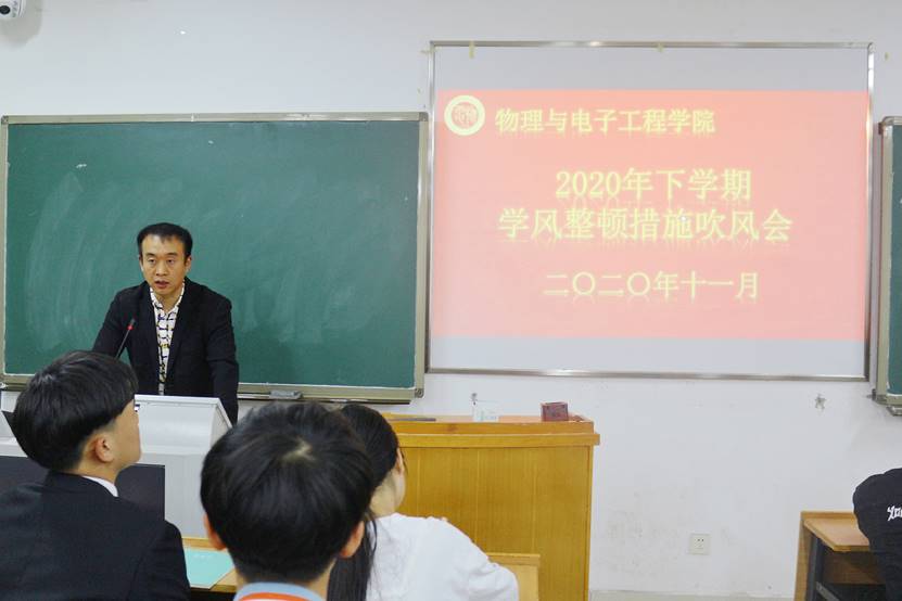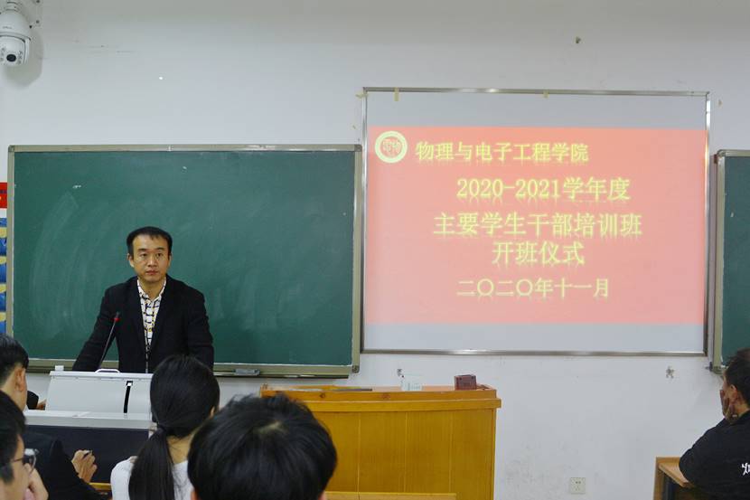 11月12日晚,物理与电子工程学院于理科楼南301召开了2020-2021学年度主要学生干部培训班开班仪式暨2020年下学期学风整顿措施吹风会。PA集团官网党总支副书记谢荣华担任本次主讲人,分团委学生会中高层干部及18-20级班长、团支书、学习委员参与会议。