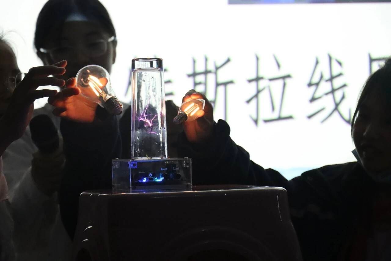 最引人入胜的当属“人造闪电”演示环节。实验员操作特斯拉线圈,模拟云层间的摩擦放电现象,一道道绚烂的“闪电”在装置中穿梭,瞬间点燃了现场气氛。实验员结合简易原理图,深入浅出地讲解了特斯拉线圈的工作原理,以及其在电力传输、无线通信等领域的应用,让孩子们了解到电磁技术与生活的紧密联系。