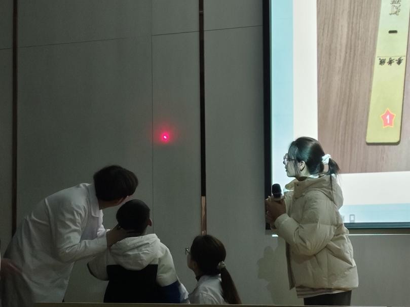 活动围绕“光绘奇妙魔法,智启科学童心”主题,设计了四个层层递进的趣味实验。“全息投影”实验中,科普志愿者利用透明金字塔与平板影像,配合光的反射原理,让“小哪吒”立体悬浮在空中,重现博物馆般的视觉奇迹;“光影追声”环节则借助气球膜、镜片与激光,将声音振动转化为墙面上舞动的光斑,让“看不见的声音”显形;在“水流导光”演示中,激光沿弯曲水流传播,展现光在介质中的全反射现象;而“克鲁克斯辐射计”则通过光照下真空罩内黑白叶片的旋转,生动诠释光能转化为动能的科学原理。每个实验后,孩子们化身“小小科学家”,亲手操作仪器、观察现象、提出问题,在“做中学”的过程中理解光学知识,现场惊呼与掌声不断。