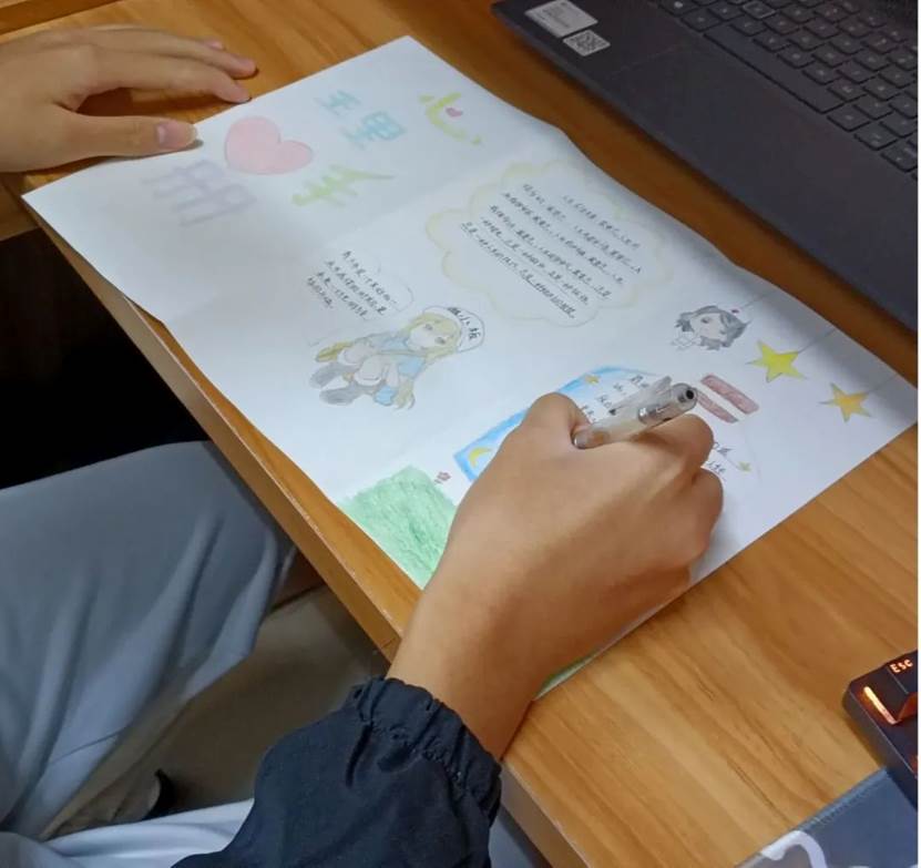 本次活动各班以5-7人的小组为单位,主要围绕心理健康知识问答、入学适应、自我意识发展、调适优化人际关系、压力应对、情绪管理等题材进行心理手册的制作。娟秀工整的字迹与精美的图画配合相得益彰。