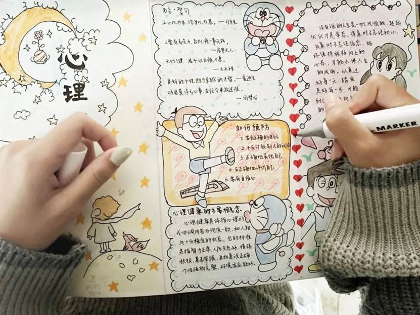 过程中,同学们明确分工、收集活动相关材料、相互协作,认真完成并交出了一幅幅形式新颖、内容丰富的心理手册作品。
