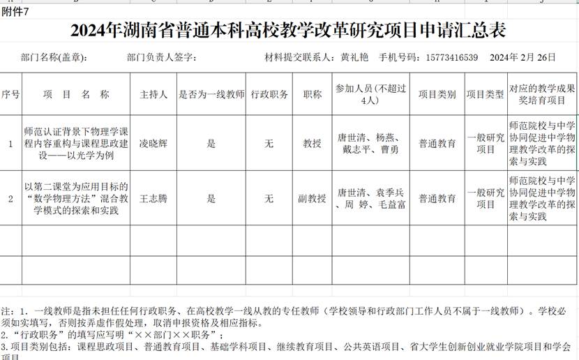 经老师们自行申报,学院学术委员会、党政联席会议集体研究讨论,物电学院推荐唐世清老师参评2024年湖南省普通高等学校教学改革研究项目。如有不同意见请于5日内向学院班子反映,预期不予受理。