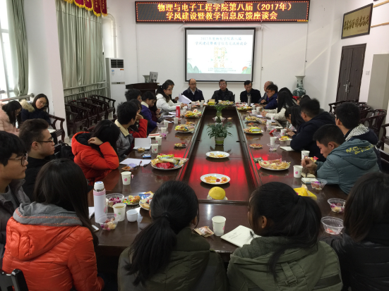 “扬博学之道,兴笃行之风”。 12月17日上午,物理与电子工程学院在理科楼北404举行了第八届学风建设暨教学信息交流座谈会。本次交流座谈会特邀PA集团官网党总支书记朱三国、副院长龙祖强、副书记张先学、考研指导王文炜副教授以及实验室主任罗昌由博士与15-17级各班代表进行了深入交流。