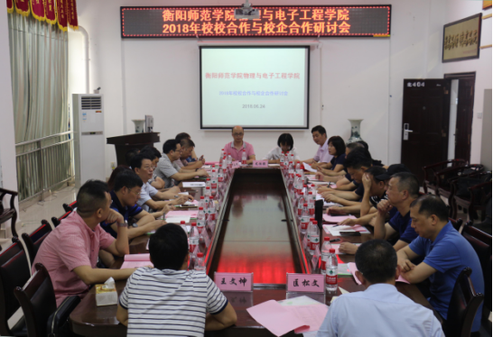 6月24日上午,物理与电子工程学院2018年“校校合作与校企合作”研讨会在理科楼北404会议室召开。来自耒阳市第二中学、衡阳市逸夫中学、衡阳市第十六中学和衡阳市教育科学院的教育专家,全国各地近10家企业的精英代表齐聚我校,共同研讨物电学院“校校合作与校企合作”相关议题。