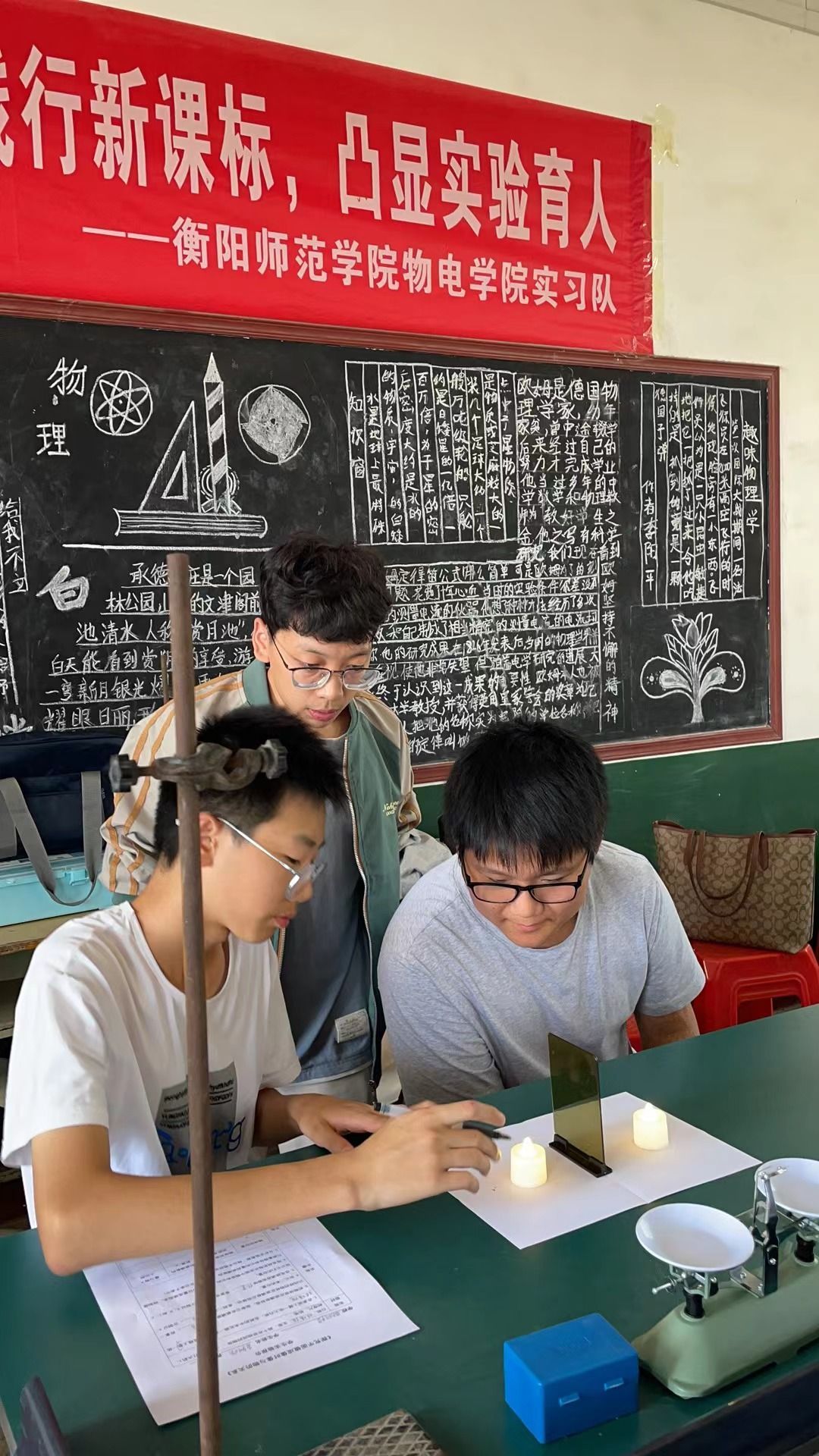 酃湖中学作为市郊的一所区中学,实验设备严重不足,且老化严重,师资配备很不到位。物电学院领导决定拨出实习专项经费5000余元,把课标规定的21个分组实验设备项目配齐、套数配足,同时各个学生演示实验及兴趣探究常备装置也添置到位。这学期,又恰逢酃湖中学将代表衡阳市迎接湖南省教委的实验抽检评估,物电学院所做的一切如同雪中送炭。酃湖中学的学生在实习老师热情的鼓励、耐心的讲解下,个个探究兴趣盎然。求真务实的科学态度、安全规范的操作意识、协作交流的团结精神在一个个实验中不知不觉养成。实习生在实验教学中对实验育人的价值认识更加到位,对实验课从课堂组织管理到引导学生探究的教学艺术不断积累。实习老师营造洋溢浓厚快乐探究氛围的课堂常常吸引实验室隔壁的校领导情不自禁地参与进来,班主任及其他老师也常常来驻足“打卡”。 每一个实验课的开展都是在中午,实验项目多、覆盖学生多,所以实习生及指导老师周末和午休都处于紧张的磨课、上课状态。虽然绝大部分实习生考研复习压力很大,但大家都精益求精备好每一分钟课。衡阳师院物电学院集中教育实习的这次主题教学活动紧扣2022版《义务教育物理课程课标》,不仅极大激发了孩子们物理学习兴趣及科学探究热情,还让酃湖中学从领导到普通老师对实验育人价值有了更直观的深刻体会,起到了新时代、新教育一定的领跑示范效应。