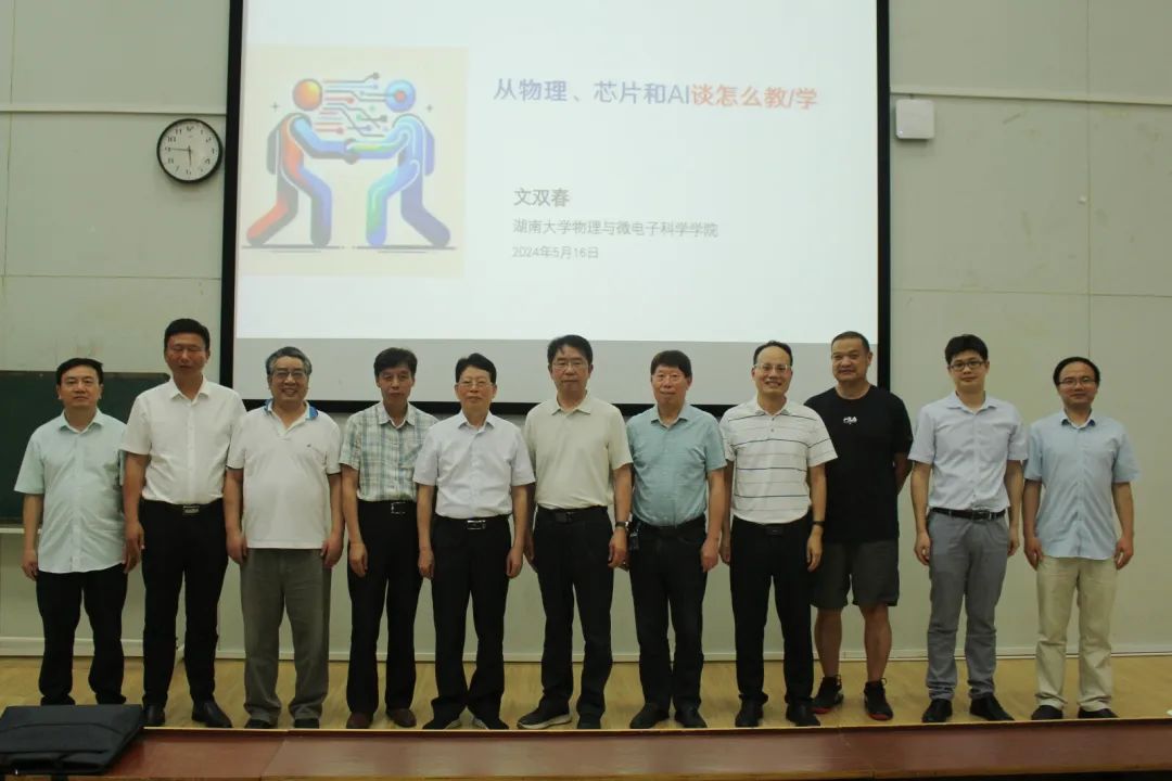 2024年5月16日下午,湖南大学物理与微电子科学学院院长文双春教授应邀莅临我校,为师生们带来了题为《从物理、芯片和AI谈怎么教怎么学》的精彩讲座。本次讲座就大学的教和学如何适应人工智能的发展,教大学主要教什么、怎么教以及读大学主要读什么、怎么读的问题展开讲座。原副校长张登玉教授、院长谭延亮教授、原院长游开明教授、原院党总支书记高峰教授、教学工作负责人凌晓辉教授及多位教师代表出席,师生们积极参与,现场气氛热烈,讲座取得圆满成功。