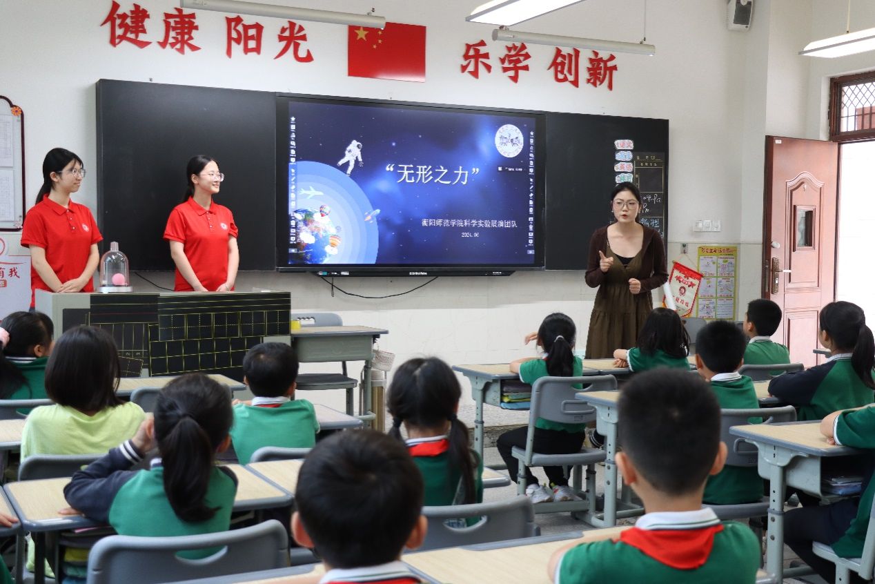 6月6日下午,物理与电子工程学院唐世清教授、赵宜鹏博士带领的科普团队走进了衡阳市珠晖区可津小学,组织开展了丰富多彩的科学实验展演。团队带领三年级小朋友们一起完成了“吸水的杯子” “神奇的密封瓶” “虹吸的奥秘”等科学小实验,让孩子们能够亲自参与、体验实验,通过观察现象、提出问题、动手实验,拓展科学知识边界,增强了孩子们对科学的兴趣。