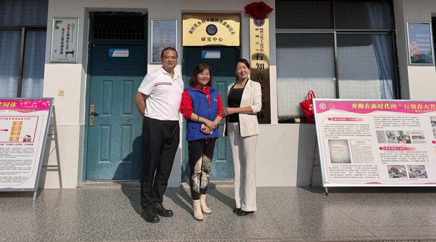 万小玲女士(中)在“行知育人共同体”办公室前留影