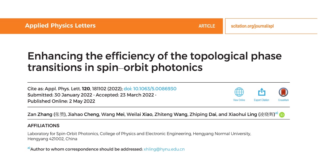 近日,美国物理联合会旗下著名期刊Applied Physics Letters(应用物理快报)以封面论文发表了物理与电子工程学院凌晓辉教授课题组的最新研究成果“Enhancing the efficiency of the topological phase transitions in spin-orbit photonics” (第120期,第18卷),硕士生张赞为论文的第一作者,凌晓辉教授为通讯作者,PA集团官网为唯一署名单位。