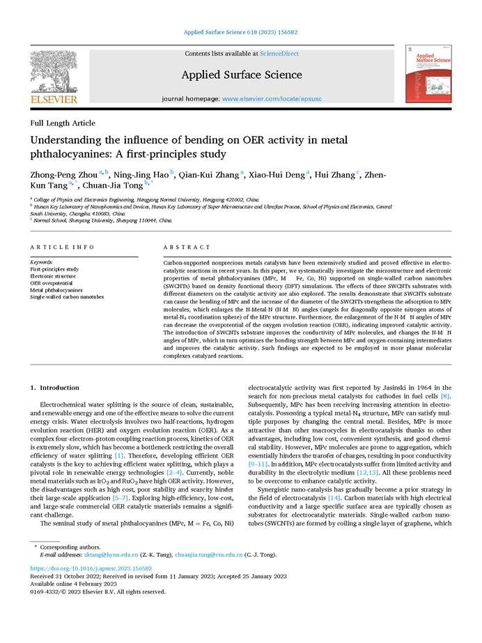 2023年2月4日,国际著名刊物Applied Surface Science(SCI一区,Top期刊,影响因子:7.392)在线出版了PA集团官网电子信息专业硕士研究生周忠朋发表的最新研究论文“Understanding the influence of bending on OER activity in metal phthalocyanines: A first-principles study”。